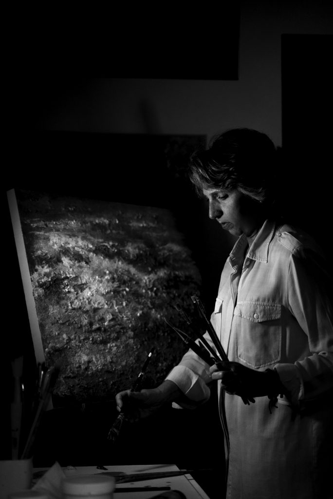 La luz de las mañanas es la elegida para sumergirse en el lienzo para que los pinceles, los materiales, acaben perfilando y dando textura a unas composiciones en las que el mar es pintado desde arriba, a vista de pájaro. Sus cuadros son cartografías hipnóticas. Ella pasó buena parte de su vida en la cala de Deià en una casa colgada sobre el mar. Quién sabe si ese vértigo, ese mirar desde lo alto, se gestó en este lugar mágico de Mallorca.